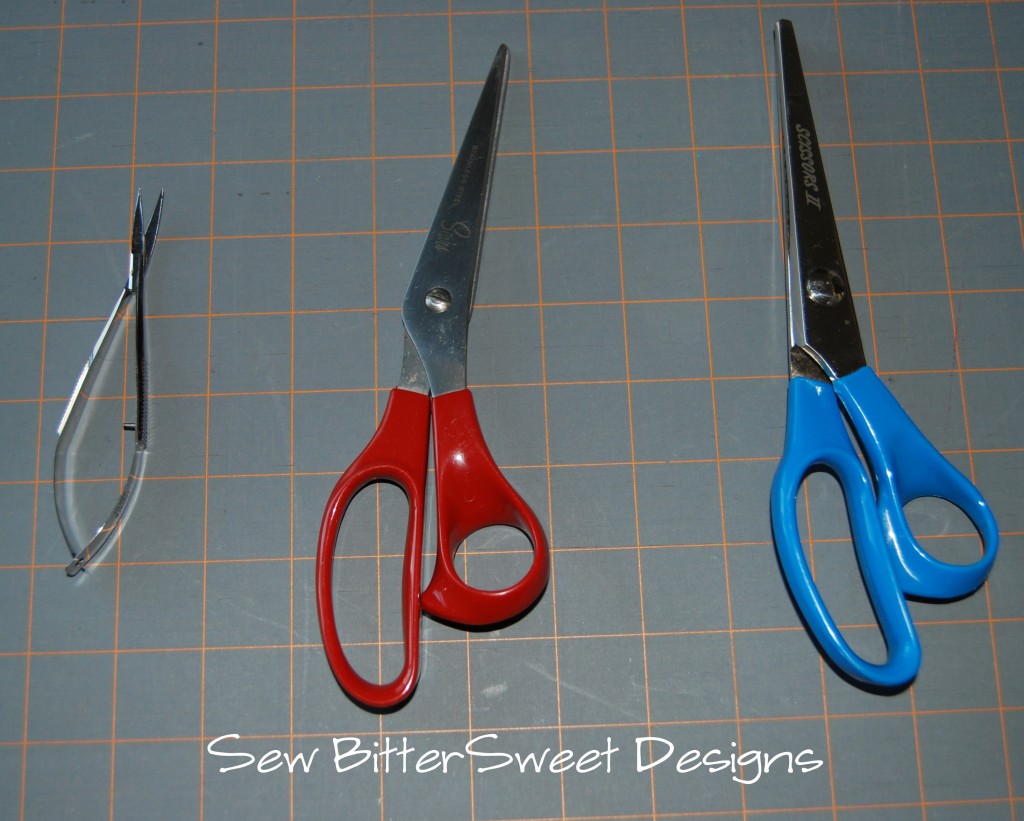From left to right: Applique Scissors, Sharp Cutting Scissors (these are my mom’s I usually use my Gingher Dress Maker’s Shears), and Pinking Shears.