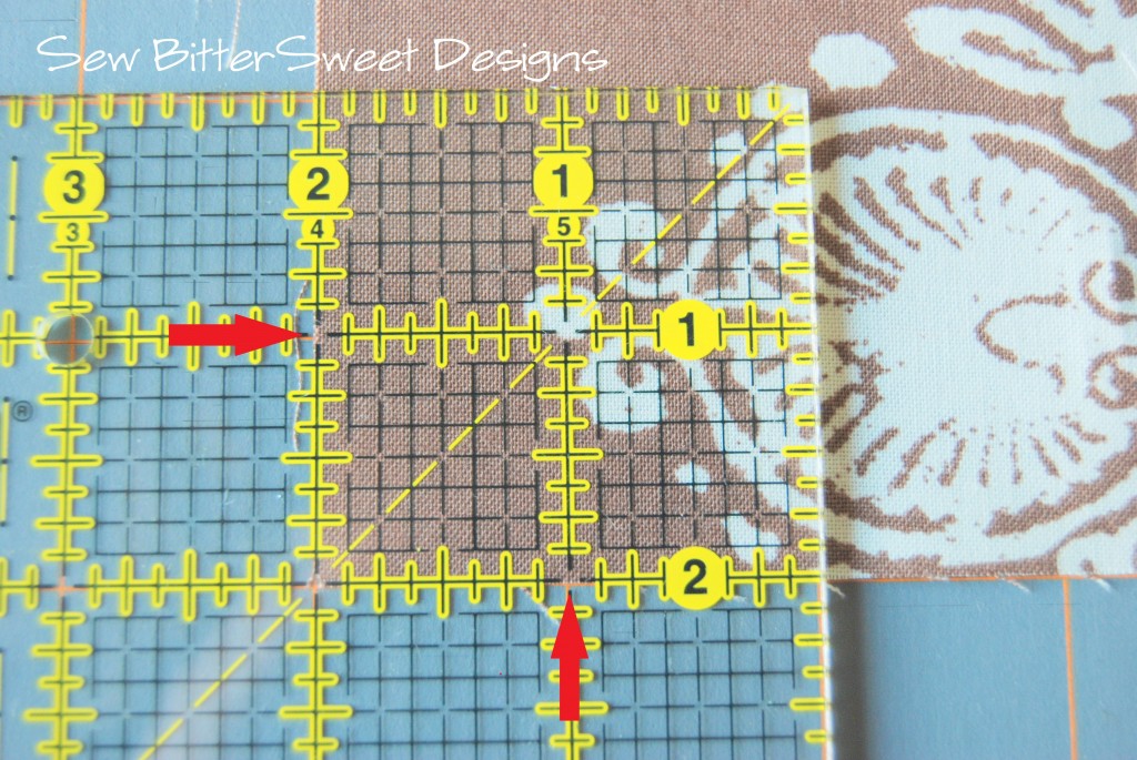 Your fabric should sit flush with the bottom of the black line on the bottom 2 inch line. It should also sit flush with the left hand side of the black 2 inch mark on the top.  Having your fabric lining up flush with the black mark will give you a smidgen more fabric and it will help you achieve your perfectly sized blocks.