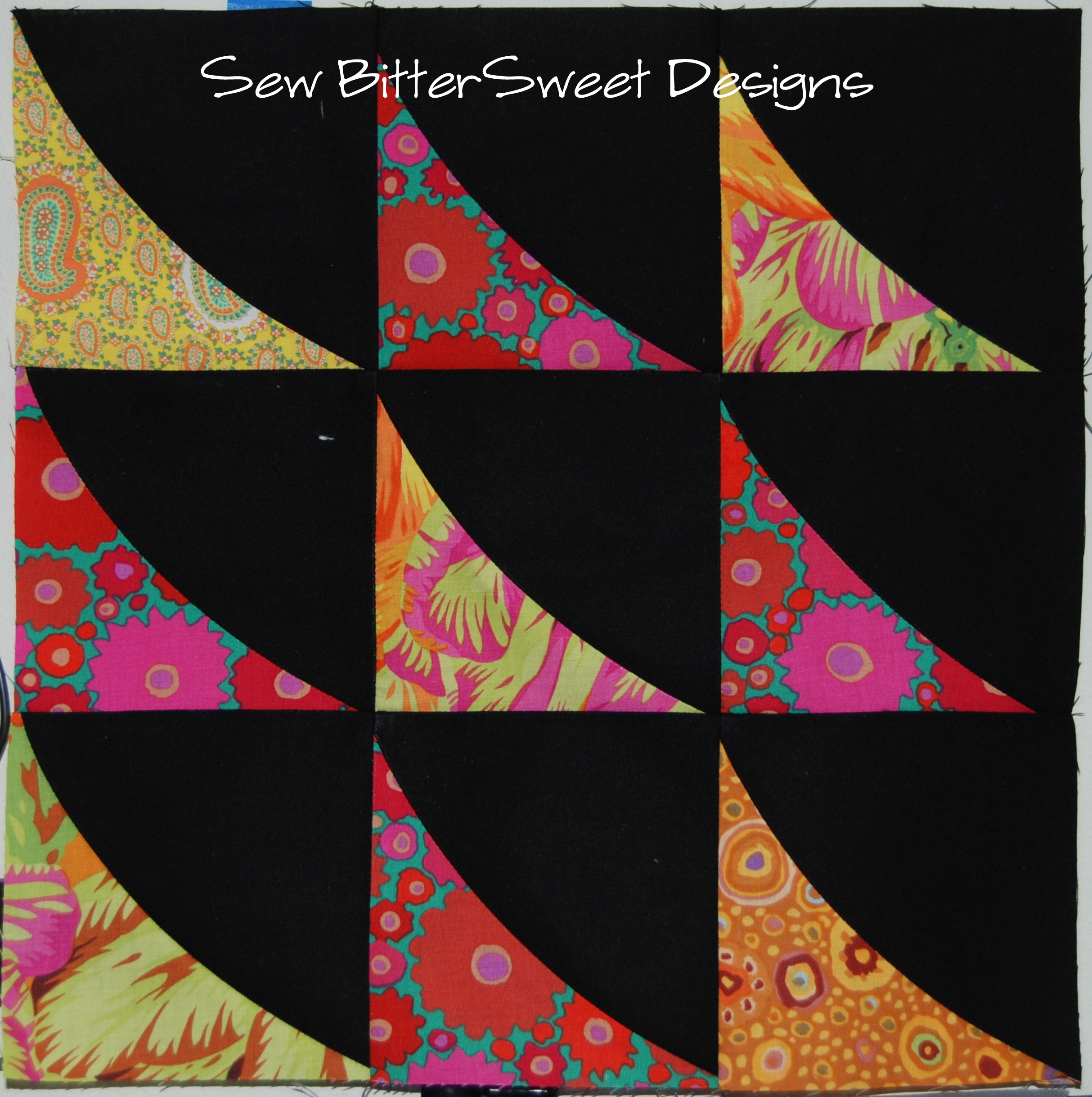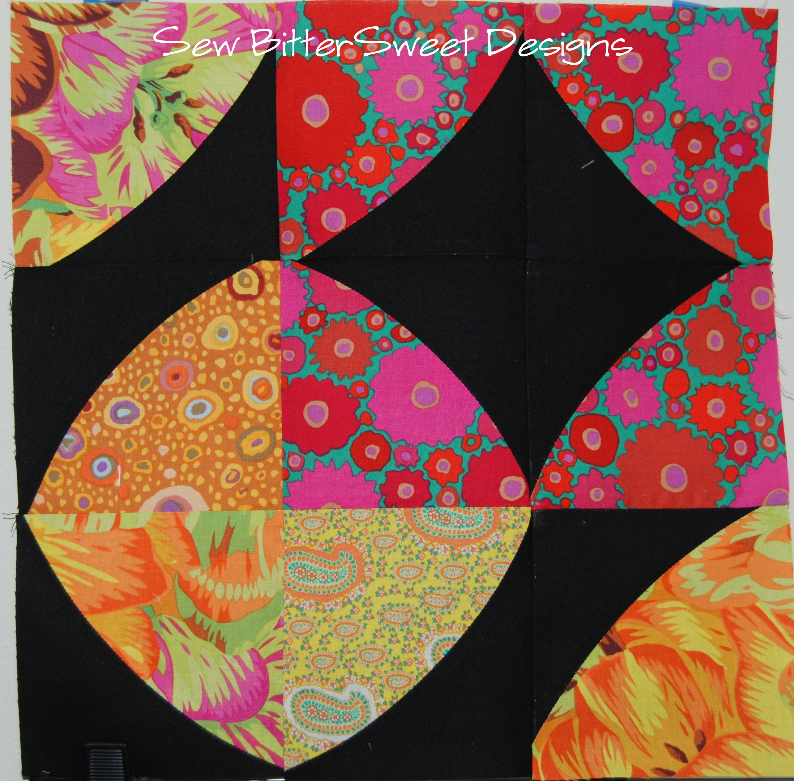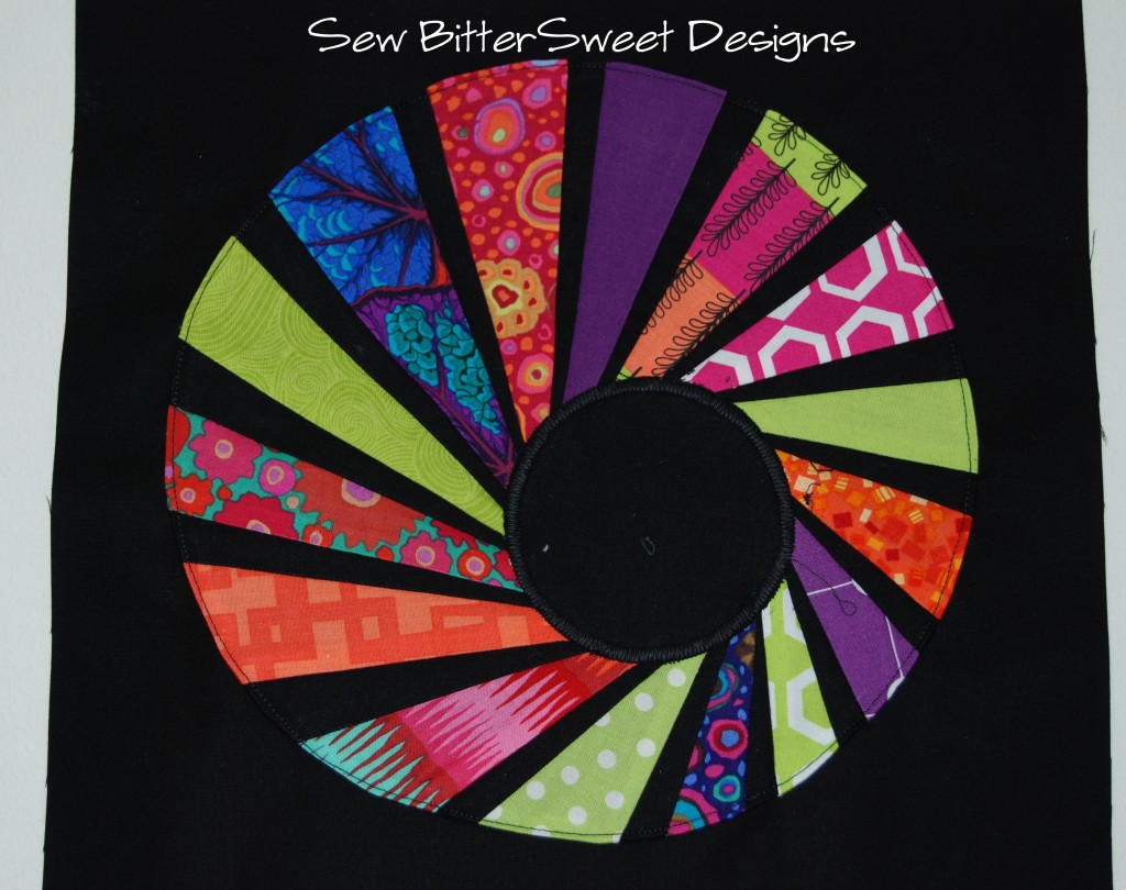 I have to say, I was super intimidated when I first saw the blocks that Vicki made, but once I conquered my fear of curvy paper piecing I was pleasantly surprised. It took me longer to pick fabrics and decide on their order than it did to piece this together! The hardest part was deciding how to applique it on to my background fabric. I ended up sewing it to a black square that was barely larger than the circle, trimming the excess, then turning it through the open hole. Then I fused the black center circle on to it and zig zag stitched it in place. I pinned the entire piece to the 12.5″ square and stitched around the outside with a 1/8″ seam.