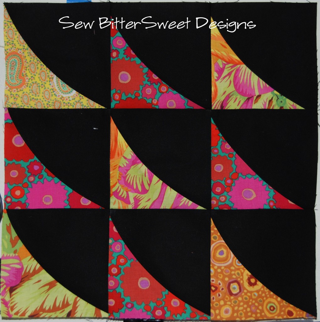 The first 2 blocks I were made with the Quick Curve Ruler by Sew Kind of Wonderful. She is doing a QAL right now with her sister and they did a curved flying geese tutorial. I followed the directions but didn’t want geese, so I took the individual 4.5″ squares and changed the lay out.
