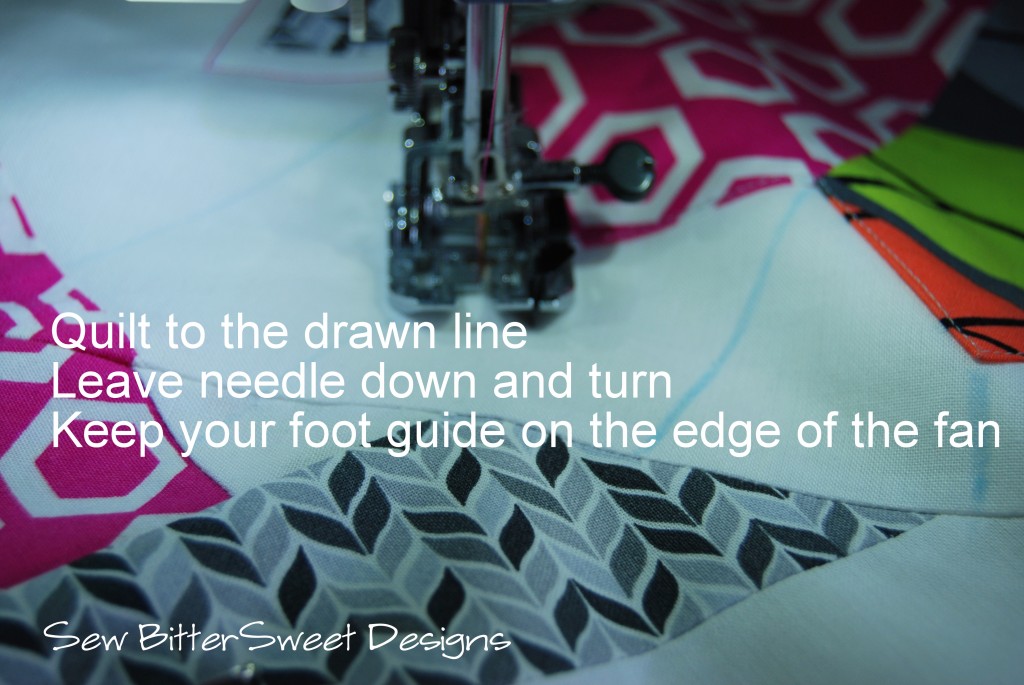 You will start your first round of quilting with your foot lined up on the edge of the Dresden, as you reach one of your lines, make sure your needle is in the DOWN position, lift your foot and pivot on the line. Readjust to line up with the edge of the Dresden and quilt to the next drawn line.