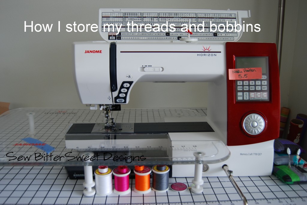 One last trick about how I quilt. When I am using multiple colored threads I pre-wind all my bobbins and store the thread with bobbin on top underneath my quilting table so that each one is ready and available when I am ready to quilt. It keeps me from having to slow down and search for a bobbin or wind one!