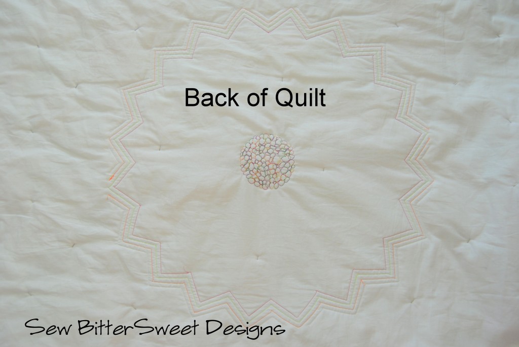 I absolutely LOVE the quilting on the Dresden and the pebbling! It looks like a flower on the back side! Cannot wait to see what you decide for the rest!