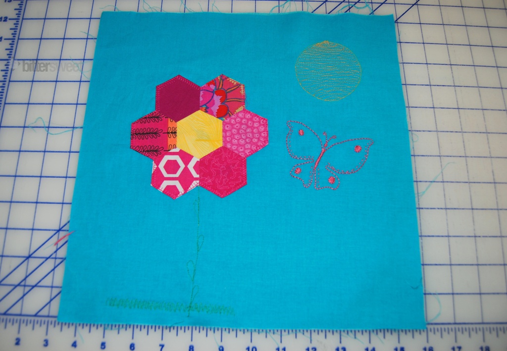 This month we are working on a quilt for a little girl, I believe she is 7. We were asked to think “Spring”. One of the suggested blocks was a hexie flower. I also did some thread painting of the stem and the sun. The butterfly is embroidered (I got the design from the Clover and Violet Embroidery 101 QAL, it is from Block 2). We were also asked not to use white fabric for our backgrounds, cheerful colors were requested. I just LOVE this blue.