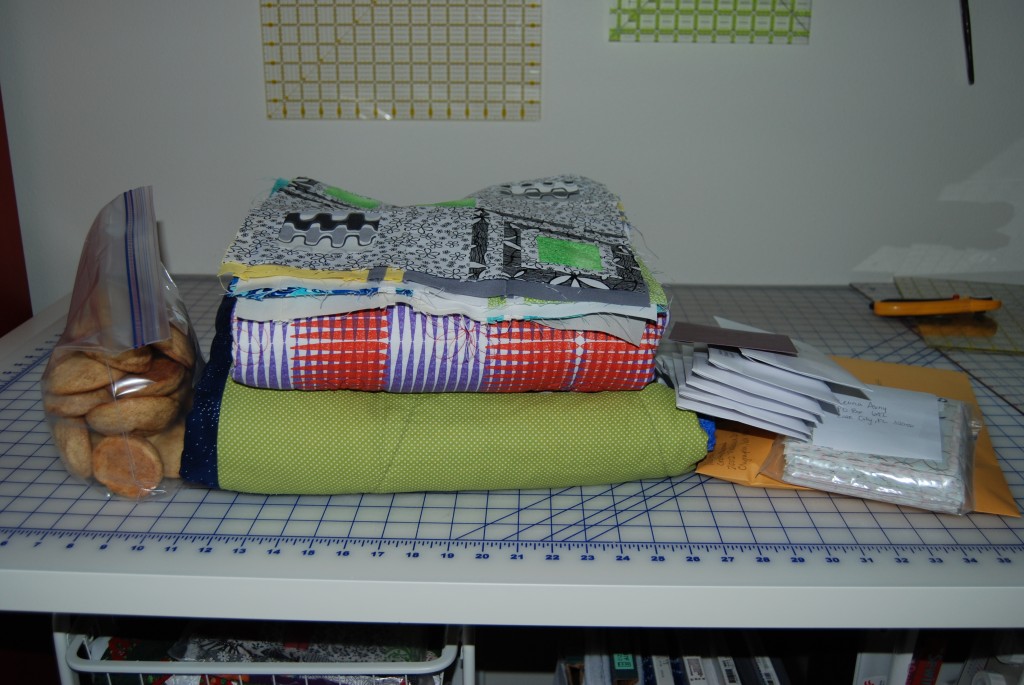 Next to that is a pile of already packaged stuff. Another 6 bee blocks, a thank you note to an amazing friend who is just so supportive, wonderful and thoughtful, a swap package from a monthly fat quarter swap group (if you are interested leave me a comment with your flickr name and I will invite you to the group) and some charms from a swap that I need to send because I can’t resist a good charm swap. LOL