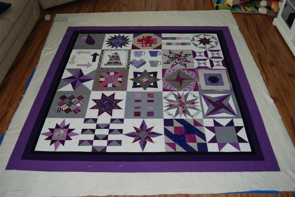 WEll, ITS Purple Gorgeous, not alot of Purple in my stash, so I sent out an order. Where did you come up with the design? Also what exactly do you mean about Basting did you sew around the edges or needle and thread. I am no expert on quilting but I have been seeing alot of clean line quilting in the colors and blocks and on the Space lots of design.