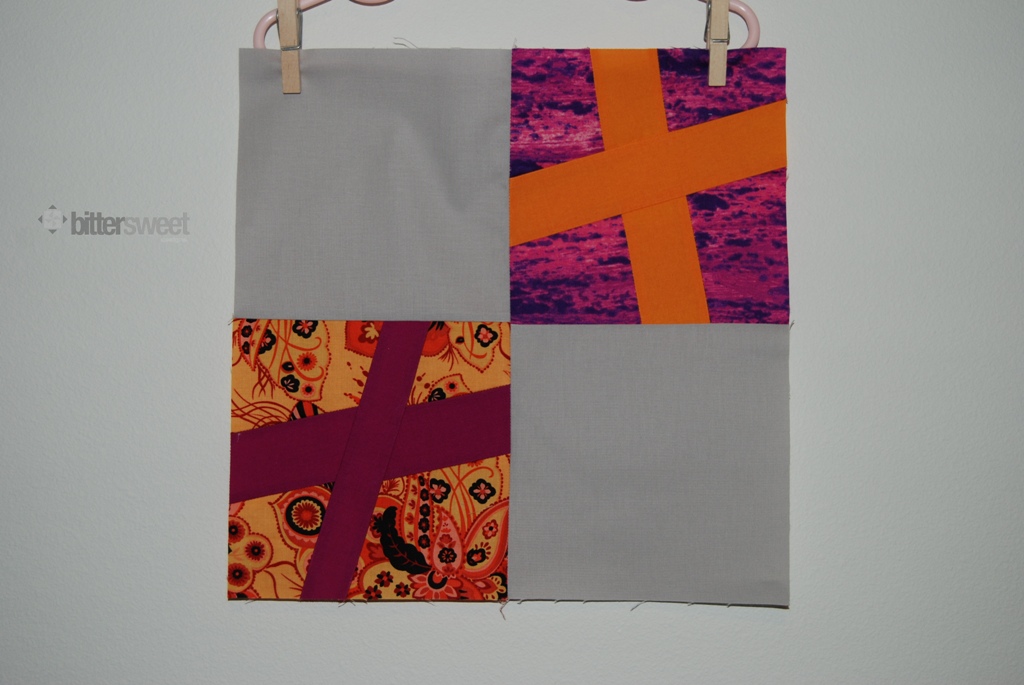 This month for Do Good Stitches we were asked to make Wonky Crosses, any way we wanted to make them. I decided to make mine in different sizes.  Each block is 12.5″ unfinished but the crosses themselves are each a bit different.  We were asked to use Kona School Bus (a orange/yellow color), Cerise (think bright magenta) and Plum. We didn’t have to a neutral but could use one if we wanted. I opted to Kona Ash to tone down the brightness.