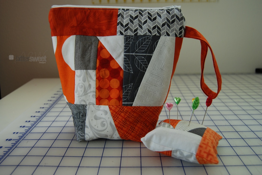 I have a ton of orange and gray scraps too, so I added some from my stash. My partner made it so easy on me, she said she didn’t have a zippered pouch and her pin cushion was in need of updating. Voila!