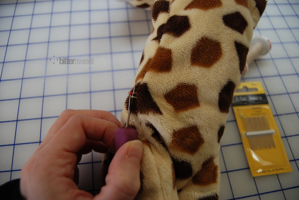 First thing is to find a seam that is on an inconspicuous side, there was no really good seam on the giraffe but ideally you would do one that isn’t front and center. Then you want to gently pull out the stitches. Try to create a hole at least big enough to fit your hand in.