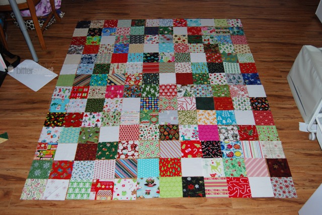 Pictured above are 154 Christmas charms and 14 solid white charms. I participated in A LOT of charm swaps 2 years ago. In fact I probably have enough left that I could make a second quilt this same size! I’ve decided to name this quilt the “Charming Christmas Quilt.”