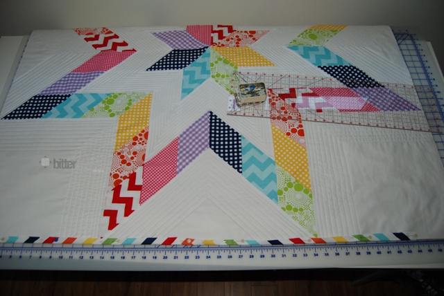 I have to say that I am really glad I am setting these simple weekly goals for myself, it is really helping me check things off the list. If you remember from last week my goal was to simply get my Riley Blake Challenge quilt backing made and get the quilt basted. Well I can happily say I blew that goal out of the water! I got it basted, quilted and trimmed!