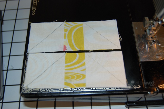 Fluttering in Formation Supplies - https://www.clone.sewbittersweetdesigns.comStart by drawing a line, corner to corner on each white square.  (See Picture)