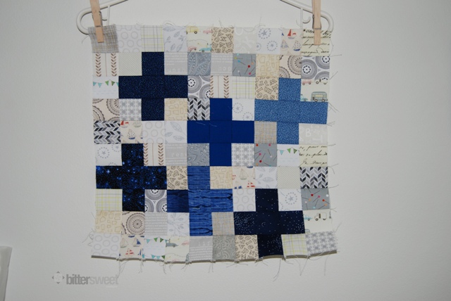 This month the Do. Good Stitches block was a bit of a challenge for me. It had 100 pieces, all measuring 2″ x 2″. We followed this great tutorial from Feeling Crafty. It is an interesting technique that involves laying all of your pieces of fabric out on a piece of fusible stabilizer and fusing them before sewing them. Go check it out! The block went together super fast considering all the pieces.