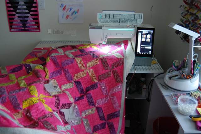 I’m really happy with the quilting design that I came up with. In fact the only quilting I have left to do is in the gray sections and the borders. I’m hoping to bust it out today during preschool!