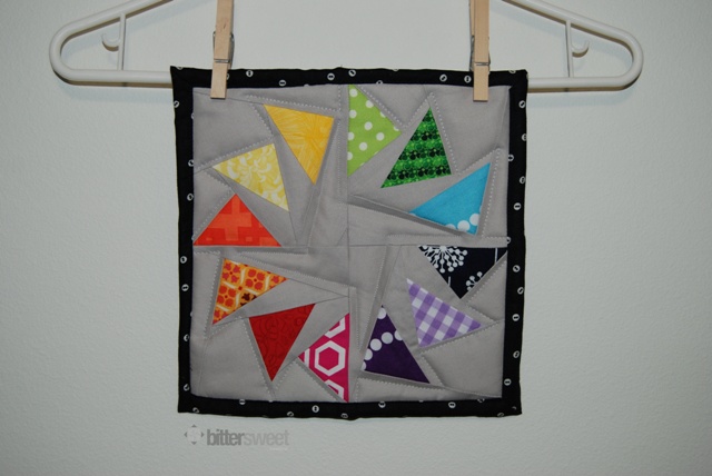 I actually downsized the pattern to finish around 8.5″ square. I used a layer of InsulBrite batting and a layer of 100% cotton batting – as stated in the directions for the InsulBrite. I didn’t got crazy with the quilting, because the two layers of batting made it pretty thick. I also didn’t bother attempting to traditionally bind this. It is so tiny, it made more sense to me to just flip the backing over to the front. I have a great tutorial here on how to do that.
