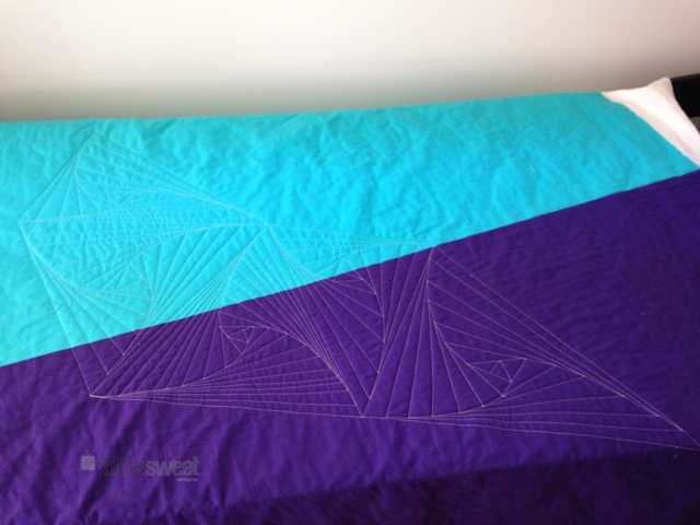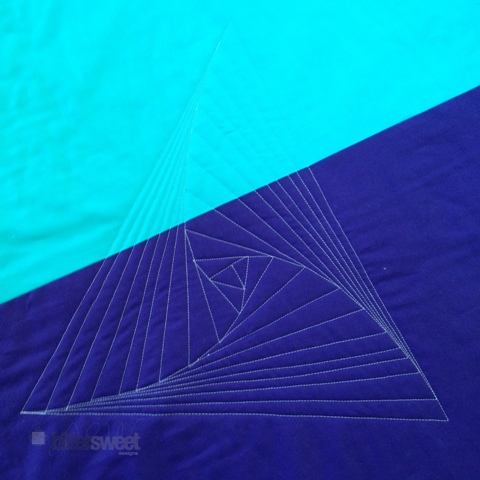 This design was inspired by the Zentangle design called Paradox. I started with a triangle of blue tape on my quilt. I used my walking foot to outline the triangle and then removed the tape. Every subsequent line I eyeballed. I continued adding triangles until the bottom half of the quilt was filled. Here is an in progress shot: