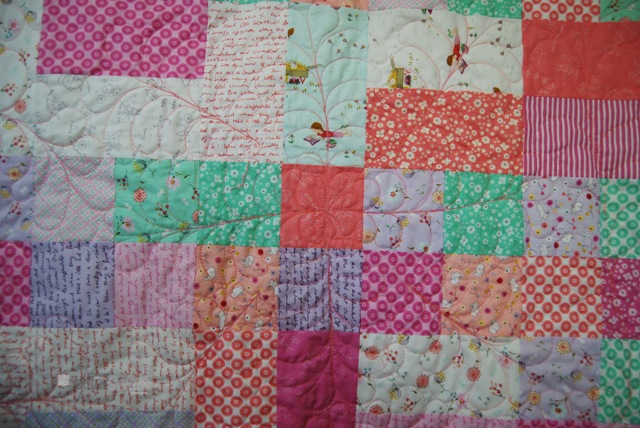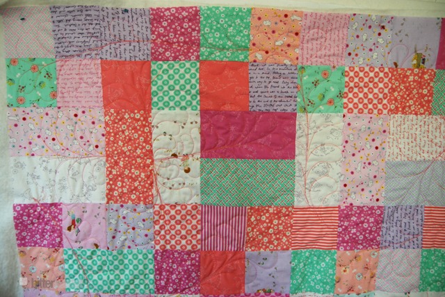 I used a layer cake of Posy by Aneela Hoey to put together this cheerful little baby quilt. Then I completely covered it in feathers. I practiced going around curves, doing them straight and using them to fill awkward spaces. I am really pleased with how they turned out.