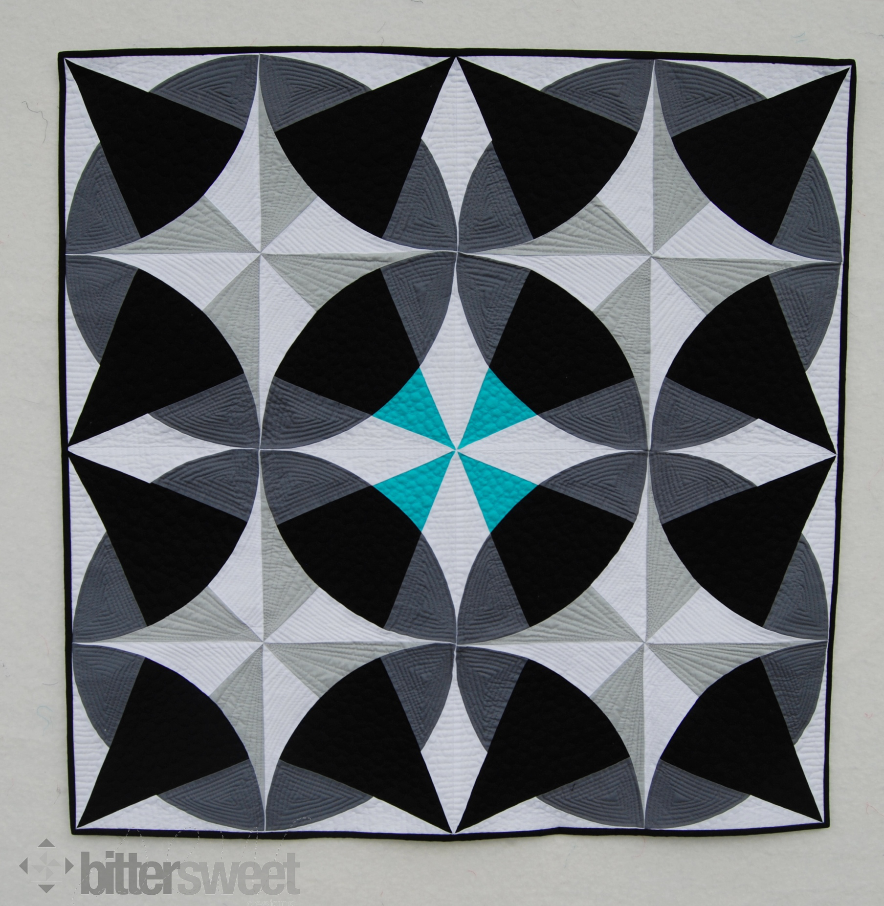 Yesterday I submitted my newest quilt design to the Quilt! Knit! Stitch! show in Portland, OR. The design challenge is to make a modern quilt using Black to White fabrics (which includes grays). We were also allowed to add one pop color in one place if we wanted. Below is my entry. I have decided to call it Hypnotic Eye.