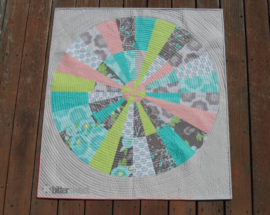 Two of the quilts I cannot reveal until later in the year. For now I am going to show my Riley Blake quilt – Top Spin. This was a challenge presented by the Modern Quilt Guild. The requirements were to make something quilted and to try something new. I tried a whole new pattern and template that I designed.