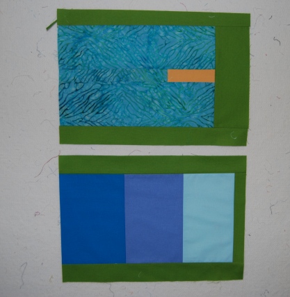 My top block I picked a batik that reminded me of rippling water, and for the second block I wanted to show the different shades of blue that you see in shallow, medium depth and deep waters. I hope I accomplished those goals.