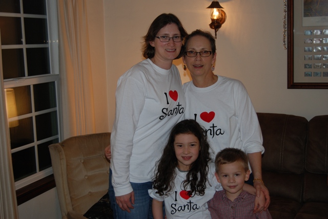 Well, I never got my picture with Santa Claus in our shirts, but we did wear them on Christmas Day!  Here is a picture of us with my sweet nephew.
