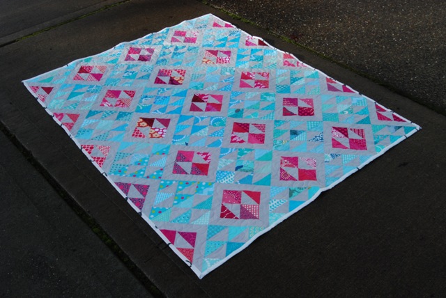 After I finished writing the pattern, I sent free copies to all of the ladies in my quilting circle and asked them to make two blocks in Aqua, Raspberry and Kona Ash. My favorite part is how scrappy the blocks are. I could never make a scrappy quilt like this from my stash, but these women are all over the country and we have such varied stashes.
