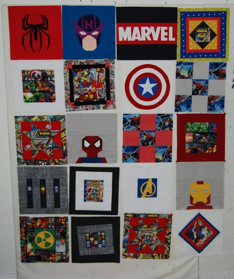 Marvel Quilt - https://www.clone.sewbittersweetdesigns.comThis is probably not the final layout, but I have to say that I love how the quilt is shaping up so far. We have a great variety of paper pieced blocks, appliqued blocks and come blocks that feature the Marvel fabrics. I am also so amazed by the talent of the women I sew with!