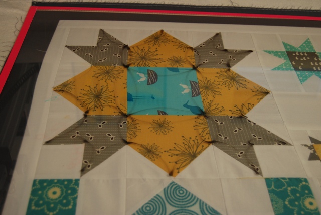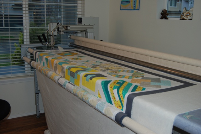 I loaded my first quilt on Spike yesterday and started quilting the first block today! I am very excited. My brilliant friend Vicki from Orchid Owl Quilts recommended getting some plexiglass to draw on and practice designs over the top of the quilt. Vicki has the same machine as I do, except she has Lightning Stitch – a more advanced regulator. Yesterday I went to home depot and picked up a sheet of Polycarbonate plastic, not quite the same as plexiglass but it serves its purpose – though I did learn I can’t use Expo Markers on it, they leave a stain, but Crayola brand dry erase markers work fantastically!