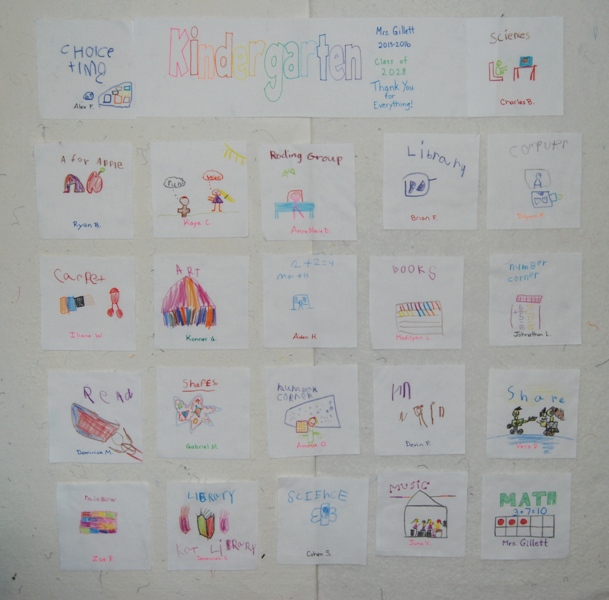 What’s that? End of Year?!? How can that be? I mean the end of the school year of course! This year I am making a very special quilt for Anne’s kindergarten teacher. In my life before Anne I was actually a substitute teacher working on my Master’s in Teaching, so teachers hold a special place in my heart. For the quilt for Anne’s teacher I had each of her students draw a quilt block with Crayola Crayons showing something they learned or did in Kindergarten. Each block I heat set with my iron and a Teflon pressing cloth. I even had the teacher make one!  I am going to sew the blocks together so that the quilt can hang in the classroom and the teacher can use it as a teaching tool for her future classes. Kindergartners telling kindergartners all the things they will learn. I have the banner made for it and today I am hoping to get the sashing in before I go volunteer at the school.