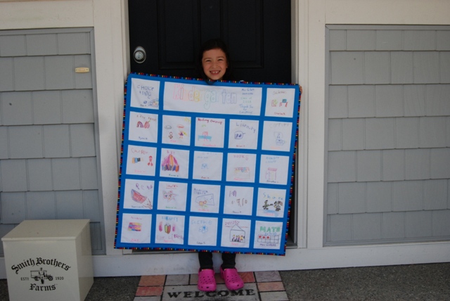 Finishing a quilt is always exciting! Last Thursday I finished the Kindergarten Quilt for Anne’s teacher. This week I am hoping to take it to school and get a photo of her class holding the quilt to frame for her teacher. That way she will always have the faces to go with the blocks. Anne loves the quilt.