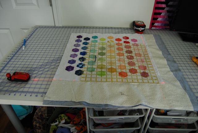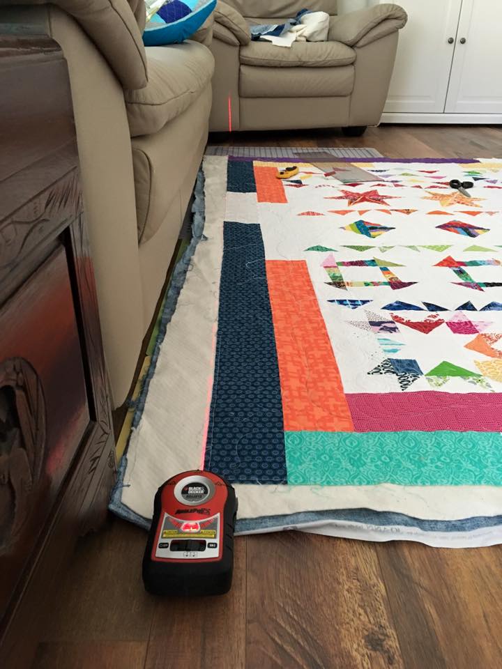 Last week I posted a picture to Instagram of me trimming a quilt with my husband’s laser level. The idea came to me because I was thinking about Vicki from Orchid Owl Quilts using laser levels to block her quilts for quilt shows, and I thought why not use them to trim my quilts too! Talk abut accuracy!