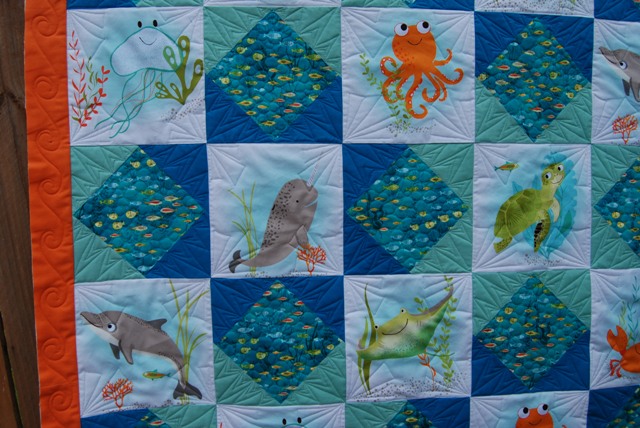 Sea Creatures Quilt - https://www.clone.sewbittersweetdesigns.comI really wanted the fussy cut sea creatures to pop so I did a quilting design that focused the attention inside the blog. You will be happy to know that my mom is quite pleased with how this quilt was quilted as well…which is good since it is hers!