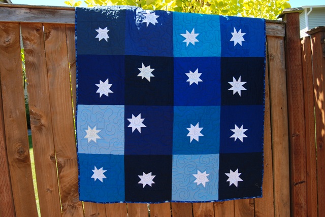 I am so excited to say that I have finished a quilt! This one was assembled with blocks made from the oh so talented ladies of the Do Good Stitches Trust Circle. I asked the ladies to use solid blues and whites to create wonky star blocks and they did such a beautiful job (as always!). This particular quilt has be actually quilted since March…but I really struggle to bind quilts so sadly it languished a bit in my “to bind” pile. I decided this week that it was ridiculous and unfair to everyone who helped make it and got my rear in gear! You may even remember my super angry concentration face (I’m not grumpy, I promise!) in this blog post.